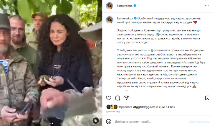 Під час спілкування з Каменських наші військові почали знімати з себе шеврони і передавати їх співачці. Це дуже розчулило артистку і вона не змогла стримати сліз: